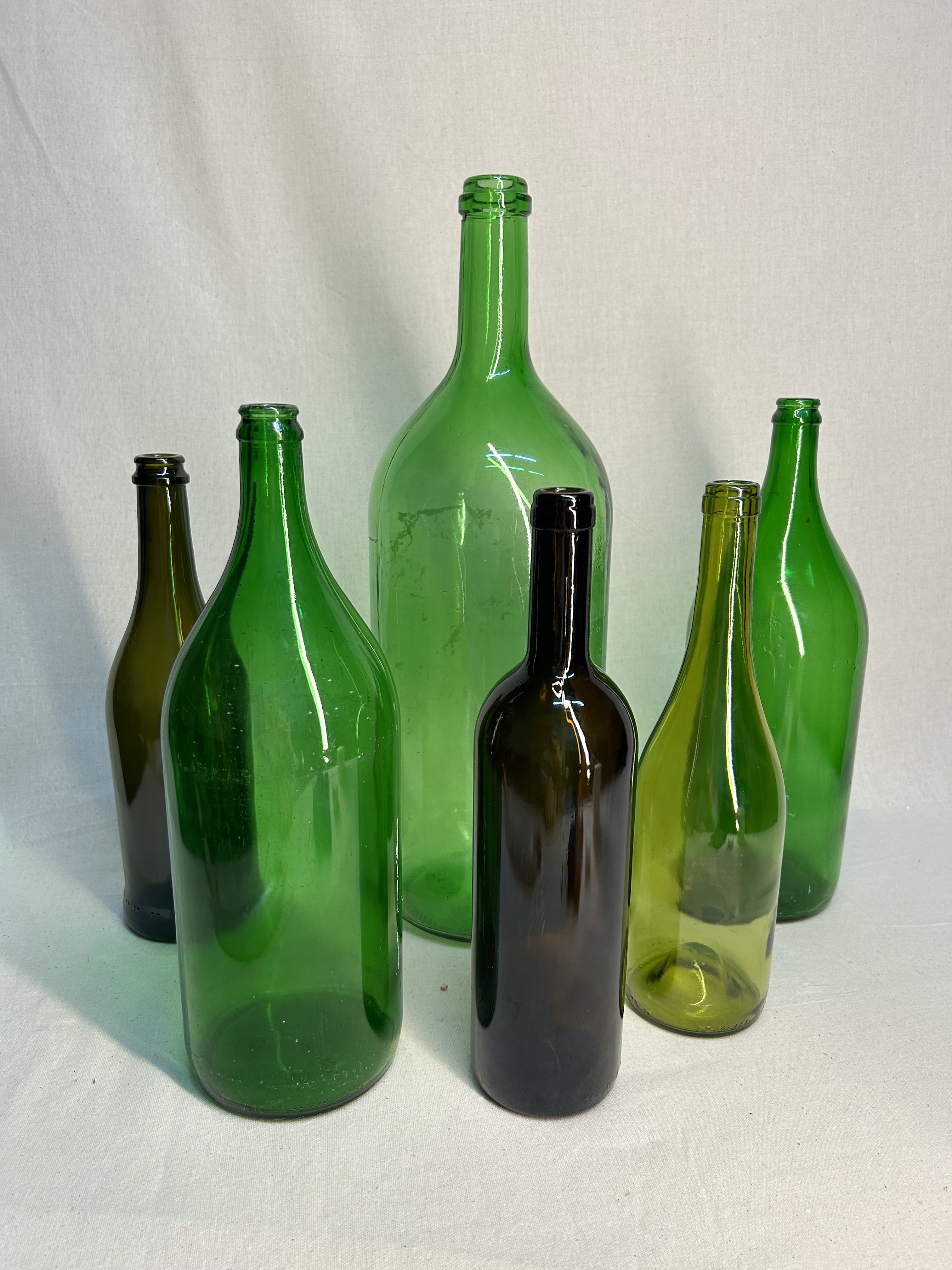 Różnokolorowe butelki po winie. Kilka kształtów i rozmiarów. Idealne do numeracji stołów lub aranżacji planu sali.