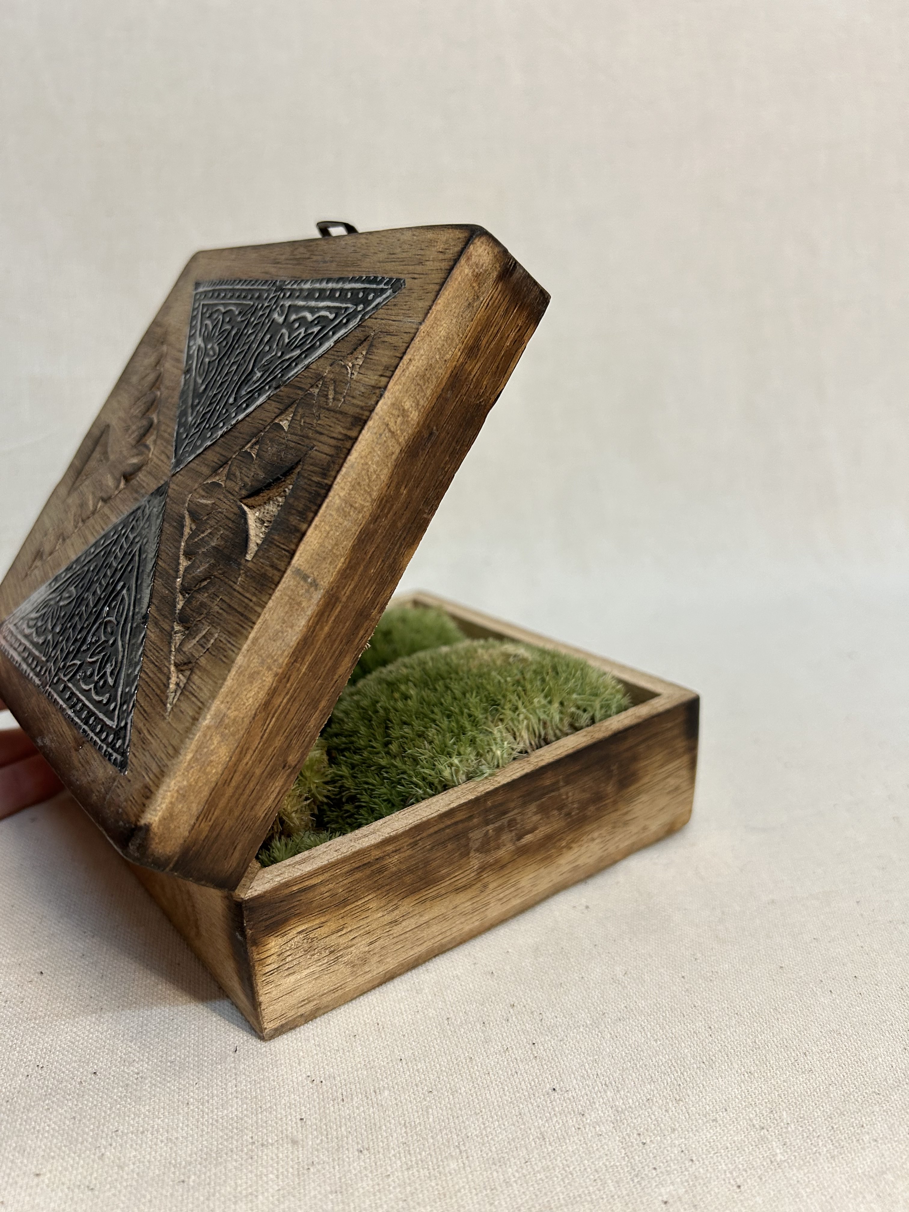 Drewniana szkatułka na obrączki z wzorem.