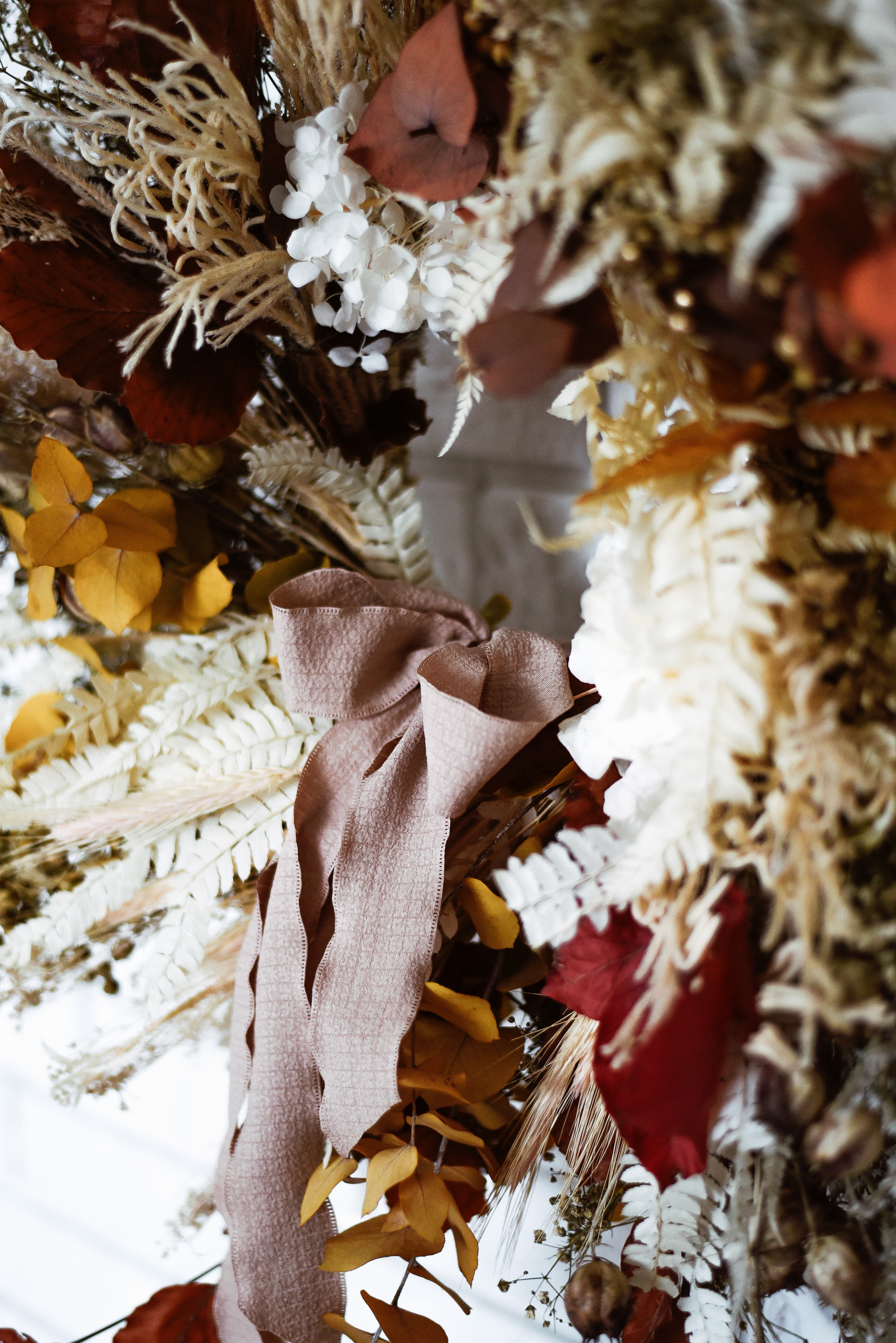 Ręcznie pleciony wianek wykonany z suszonych roślin. Stworzony z paproci i liści stabilizowanych, a także makówek, lnu i gipsówki. Piękny akcent stanowi miękka, idealnie pudrowa wstążka.