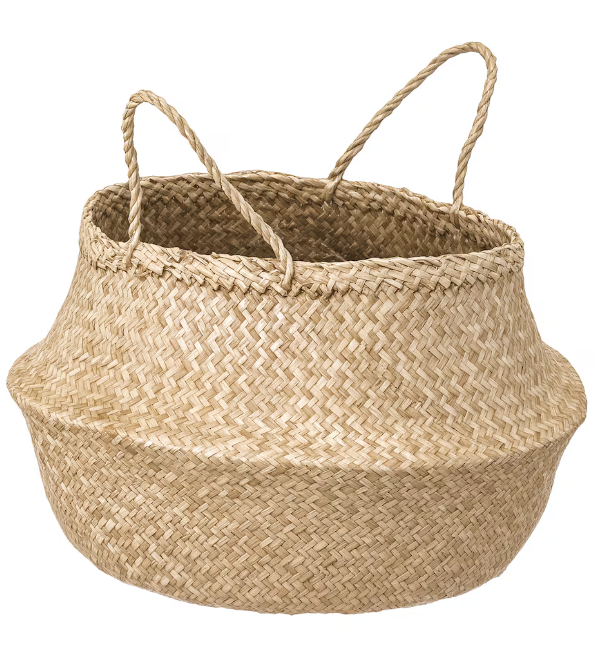 Kosz wykonany z trawy morskiej, idealny jako osłonka na roślinę doniczkową lub pojemnik na kocyki.