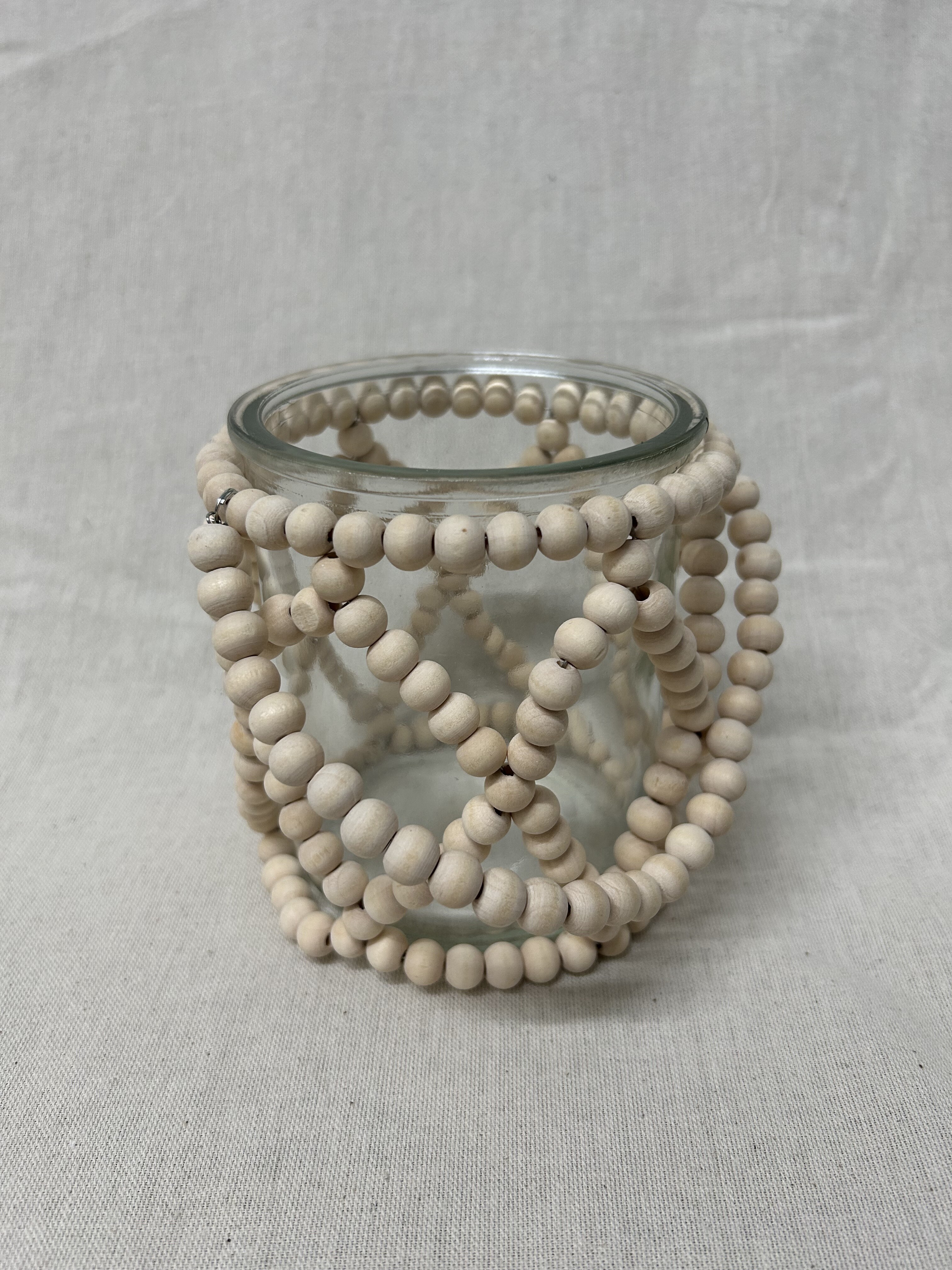 Szklany lampion z koralikami na świecę walcową lub duży podgrzewacz.